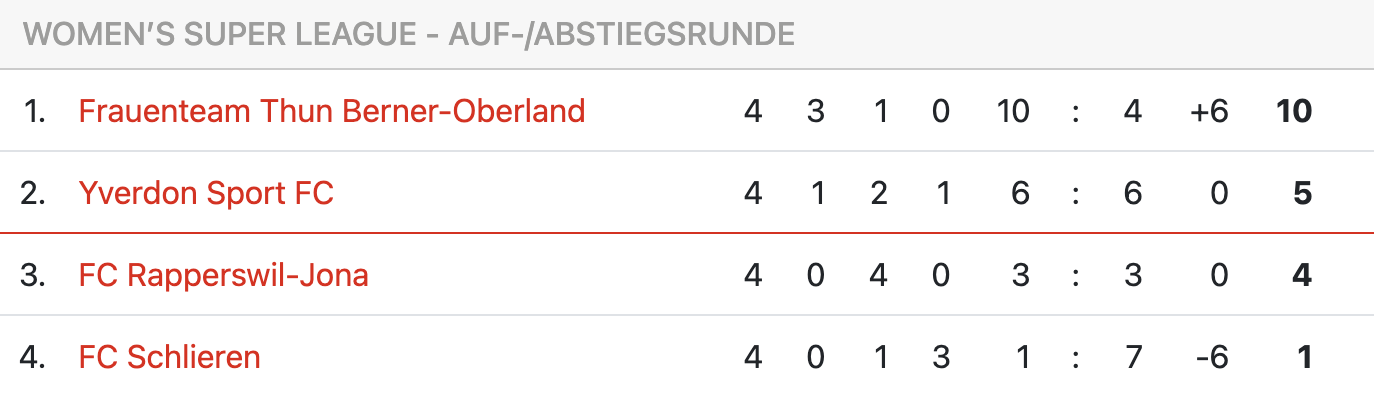 Les Yverdonnoises accueilleront donc le FC Schlieren dimanche prochain. Les Zurichoises étaient venues s’imposer lors du match de championnat en mars dernier au Stade Municipal (2-1). Cette nouvelle confrontation pourrait être décisive et permettre à Yverdon de retrouver l’élite du football suisse féminin. Pour ce faire, il faudrait que Thoune batte Rapperswil la veille, et qu’Yverdon gagne contre Schlieren ensuite.