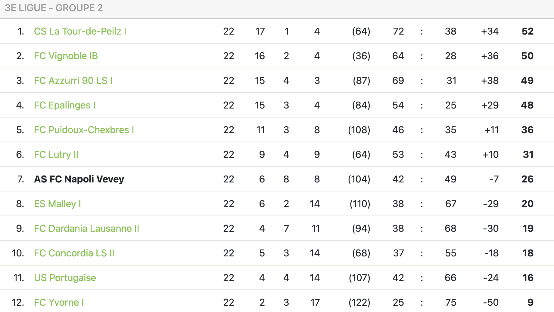Napoli Vevey a décidé de retirer sa première équipe, évoluant en 3ème ligue. Une promotion supplémentaire de 4ème ligue devrait ainsi être possible à l’issue des finales.