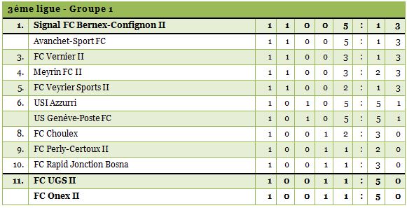 Cette première journée dans ce groupe 1 nous livre les deux premiers leaders, Bernex II et Avanchet, vainqueurs respectivement contre Onex II et UGS II sur le même score de 5 buts à 1. Pour Avanchet, c’est une confirmation de la bonne dynamique de la saison dernière. Grâce à des doublés de Buttet et Ibrahimi notamment, les hommes de Martino Papa font déjà parler leur potentiel offensif.