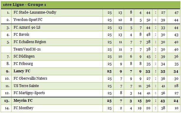 Malheureusement pour les Meyrinois, Martigny s’est également imposé – sans surprise – dans le derby valaisan contre Naters. La situation reste donc inchangée malgré cet important succès : Meyrin compte trois points de retard sur la barre. Un seul scénario sauverait les Genevois en 1ère ligue lors de la dernière journée : une victoire lors du derby contre Lancy accompagnée d’une défaite de Martigny à Echallens.
