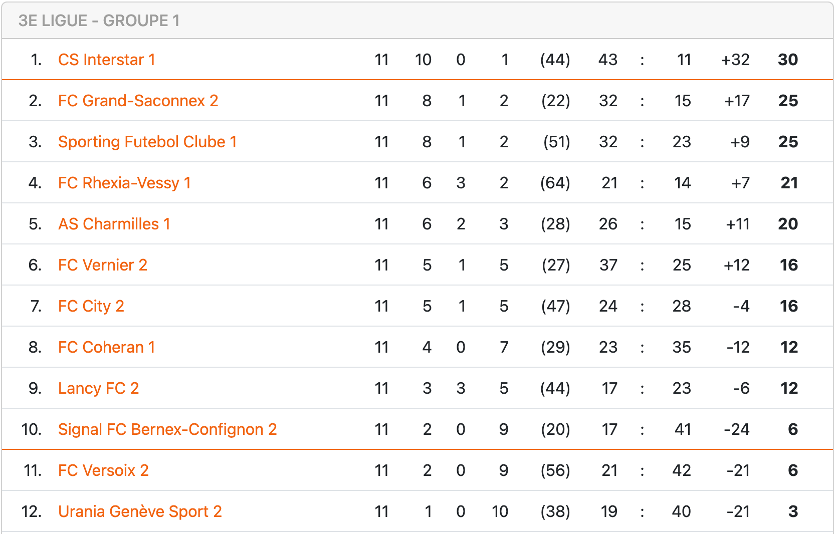 La 11ème position est partagée entre deux formations : Versoix II et Bernex II. Habituée à jouer le fond du classement ces dernières saisons, la deuxième garniture versoisienne avait pourtant bien débuté sa campagne avec deux succès cueillis lors de ses cinq premières sorties. Elle a en revanche terminé sur six défaites de rang. Le contraire d’un Bernex qui a lui mieux fini, en récoltant ses deux seules victoires lors des dernières journées.