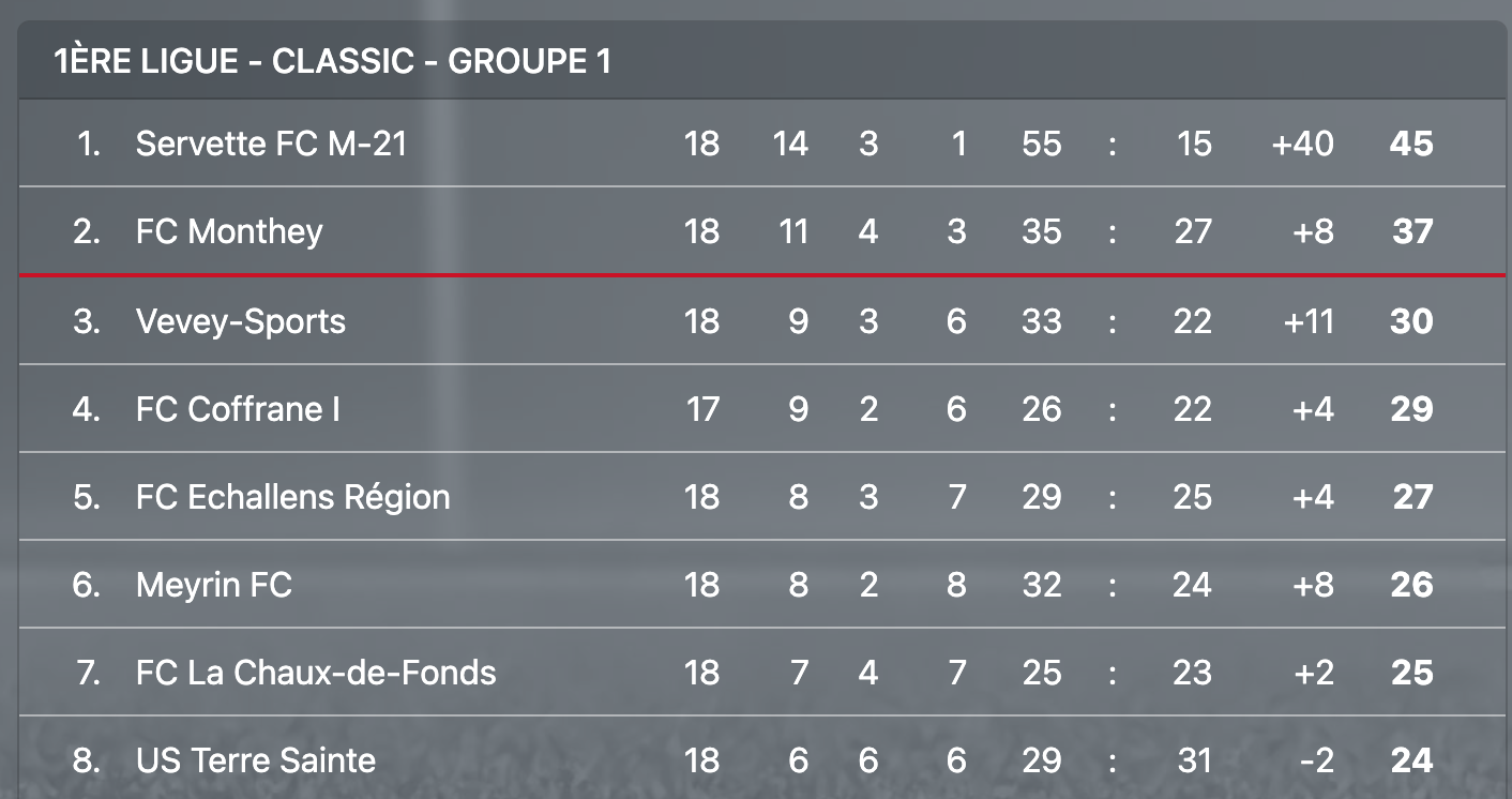 Ce second coup d’arrêt consécutif après le nul contre Chênois permet à Monthey, premier poursuivant au classement, de revenir à 8 longueurs des Grenat. Les Valaisans ont déjà grappillé 4 points depuis la reprise. Servette M21 se doit à présent de renouer avec la victoire à Sion dans une semaine. Nul ne doute que les hommes de Luigi Pisino en sont capables, mais comme l’a bien dit l’entraîneur des M21, il faudra mériter ces détails qui permettent de faire la différence.