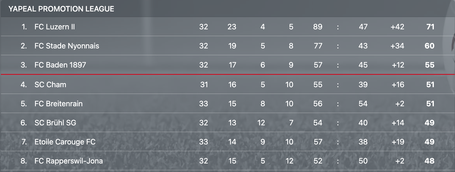 L’enjeu de ce match était double pour Carouge : rester devant Rapperswil et tenter de rattraper le retard sur Brühl. Les Carougeois ont accompli leur mission face au Stade Nyonnais (1-0), qui attend lui de connaître si la licence pour la Swiss Football League lui sera octroyée ou non. Il ne reste qu’un match à Etoile Carouge, face au champion Lucerne II le 27 mai. 1 jour plus tôt, l’octroi ou non des licences à Nyon, Baden et Brühl sera connu. Rappelons que pour le moment, seuls Rapperswil et Etoile Carouge ont obtenu leur licence. Les deux seraient donc promus si aucune autre équipe n’obtient le sésame en deuxième instance.
