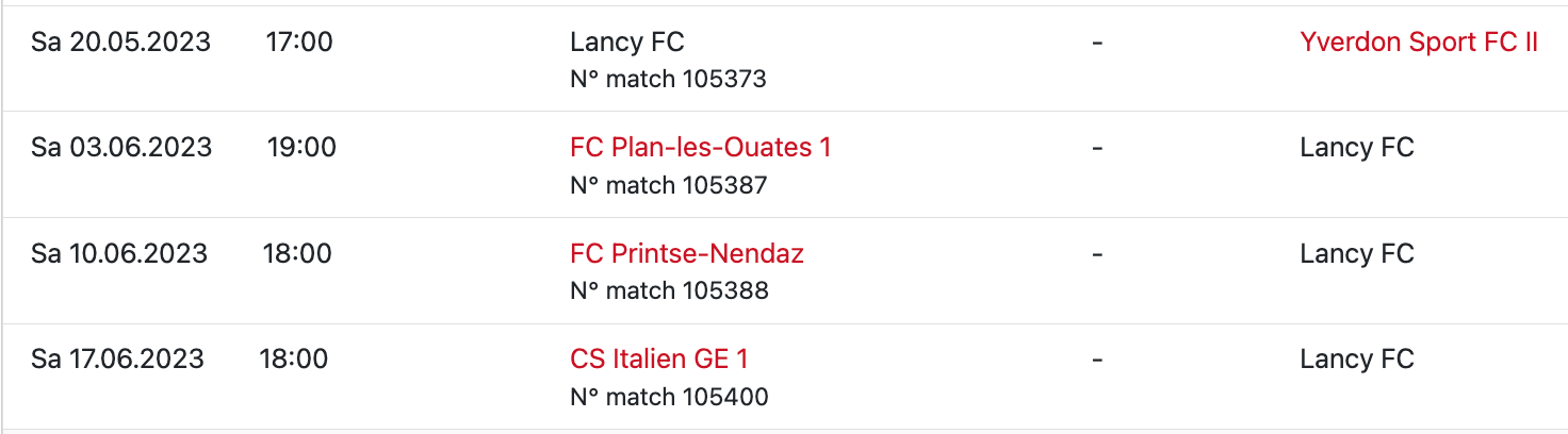 Entaîneur : Domingos RibeiroLancy (4-3-3) : Mpeck-Makendi – Bamba, Aïachi, Wague, Kaya – Tshikomb, Lopez (53′ A. Marques), Liechti – Vuzi (60′ Gonzalez), Fall, Mboso.