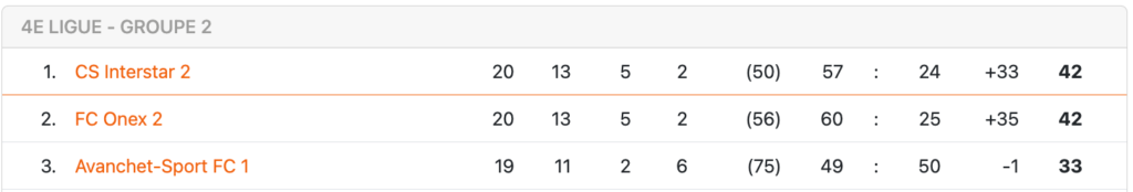 Lors des deux dernières journées, Onex II s’en ira à Aïre II, puis accueillera Chênois III. Interstar II accueillera lui Donzelle II, avant de se déplacer à Compesières II. Ce dernier adversaire, à la lutte pour le podium, pourrait être un piège pour le CSI. “On va tout donner pour gagner ces matchs. Ça va être dur, car les équipes vont nous attendre, a observé Pieczyski. À deux journées du terme, le scénario le plus vraisemblable semblerait tout de même être celui d’une première place désignée en vigueur des points fair-play. Rendez-vous le dimanche 4 juin pour sortir la calculette ?