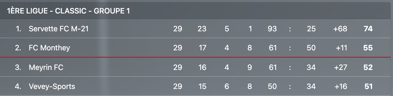 Rappelons qu’il y a deux manières de participer aux finales de promotion cette saison. Soit en tant que deuxième du groupe, soit en tant que meilleur troisième parmi les trois groupes de 1ère ligue. Pour terminer deuxième, Meyrin doit battre Chênois lors de la dernière journée, et espérer une défaite de Monthey dans le derby contre Sion II. Les Jaune et Noir auraient alors le même nombre de points que les Montheysans, mais seraient devant au vu de leur meilleur goal-average.