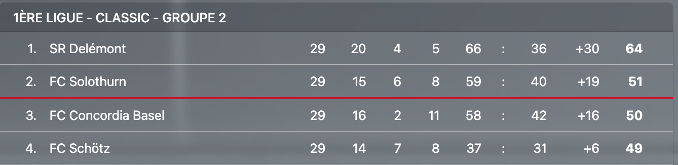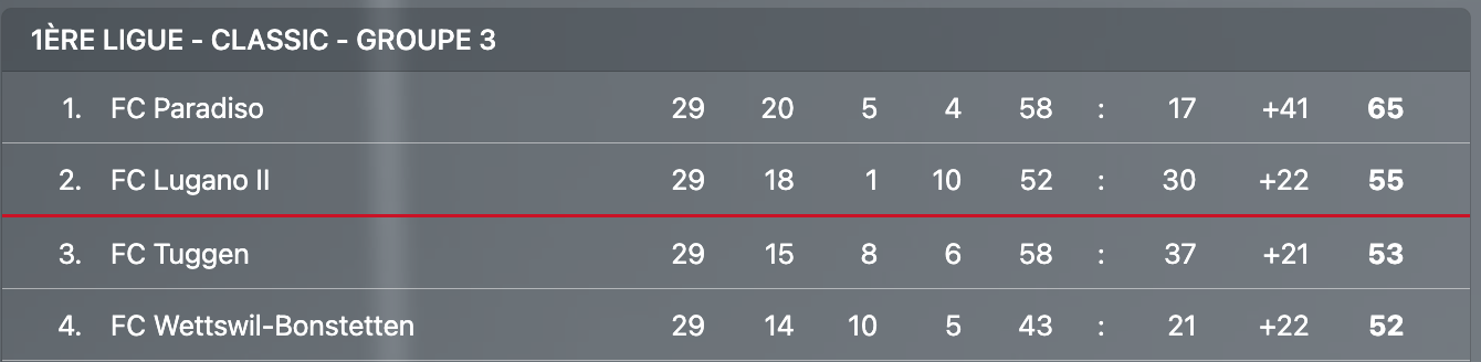 Meyrin doit donc s’imposer face au CS Chênois samedi, et dans le même temps espérer qu’aucun autre troisième ne dépasse les 55 unités. Avec son goal-average de +27, l’équipe des Arbères à un léger avantage à ce niveau-là.
