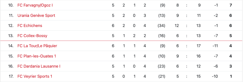 À l’heure actuelle, un quatuor genevois est particulièrement menacé par la relégation: UGS, Collex, PLO et Veyrier. La situation est extrêmement équilibrée autour de la barre de relégation, avec 8 équipes se tenant en 7 points.
