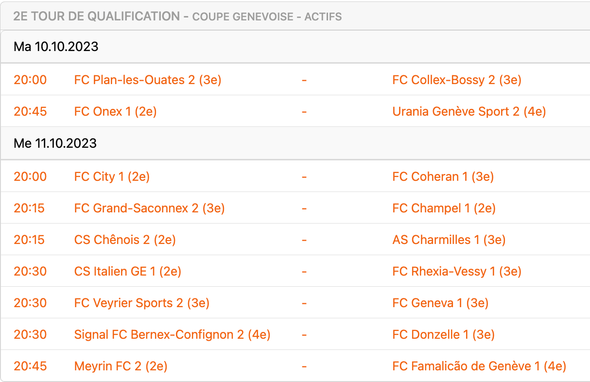 Le deuxième tour de qualification est complété par deux duels 100% 3ème ligue. Hasard du calendrier, PLO II et Collex II s’affronterot mardi (20h) en Coupe, puis dimanche (14h) en championnat. Dans le groupe I, les Chevaliers, néo-promus, devancent les Plan-les-ouatiens de 2 unités. Autre néo-promu, le surprenant FC Geneva s’en ira défier Veyrier II mercredi à 20h30. Les Veyrites restent sur une série de 4 revers en championnat et tenteront de rebondir à la maison.