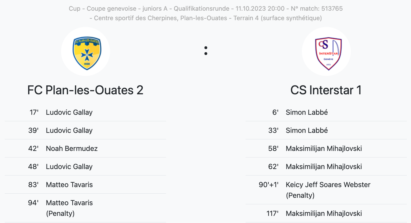 Ce mardi se déroulait le premier des matchs de qualification pour la Coupe genevoise des juniors A. PLO recevait Interstar aux Cherpines (20h30). Une partie spectaculaire et indécise au bout des 90 premières minutes, lors de laquelle les deux équipes ont chacune marqué 5 buts. Les prolongations ont ensuite vu l’équipe de Luca Francolini prendre l’avantage grâce à un penalty de Matteo Tavaris (94′, 6-5), avant que Maksimilijan Mihajlosvki (117′, 6-6) n’égalise au bout des 120 minutes. Un résultat final de 6-6 qui a donc poussé les deux formations jusqu’aux tirs au but.