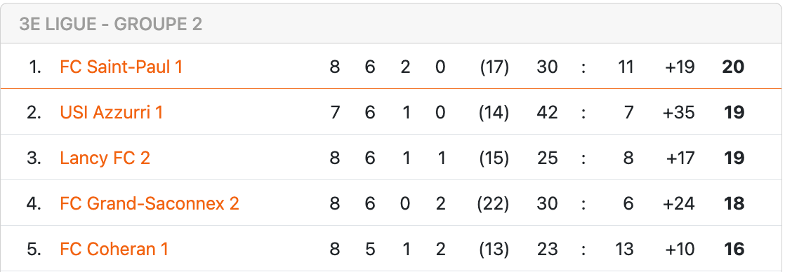 Grand-Saconnex II se retrouve éjecté du podium. En effet, si Saint-Paul et Azzurri se partagent les deux premières places, une équipe surprise s’est invitée à la fête et occupe actuellement la 3ème marche : Lancy II. Le haut de tableau de ce groupe 2 est passionnant et nous réserve de nombreux chocs dans les semaines à venir, à commencer par le week-end prochaine avec Grand-Saconnex II-Lancy II et Coheran-Azzurri.