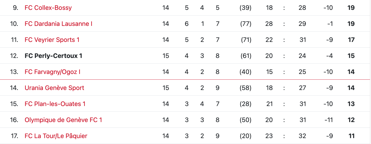 Questionné quant au bilan de la fin du premier tour, le capitaine perlysien a répondu ainsi : “Pour l’instant, on a 15 points. C’est positif pour une équipe qui vient de monter.” Comparé aux autres équipes genevoises, Perly est en effet pour le moment en meilleure posture qu’UGS, Plan-les-Ouates ou l’Olympique de Genève. Cependant, à une journée de la fin, Perly-Certoux pointe à 12ème place, avec un seul point d’avance sur la zone rouge. Une victoire contre Echichens pour la dernière avant la trêve ferait le plus grand bien.