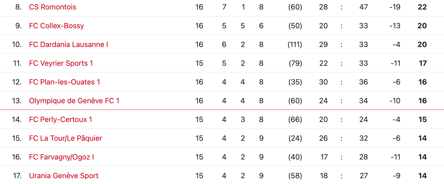 Le néo-promu Perly est relégable avec ses quinze points en autant de matchs. L’équipe perlysienne était plutôt bien partie en début de saison, mais a terminé 2023 sur les rotules, perdant ainsi du terrain au classement. L’entraîneur Raffaele Del Rosso est conscient de la situation dans laquelle se trouvent les siens : “On a réalisé qu’on était au pied du mur”, assure-t-il. “On sera dans une opération sauvetage au deuxième tour, et on se concentrera pour ce faire sur une progression de l’équipe. Il faut que les joueurs soient disponibles dans leur état d’esprit, et si on a cela, on va progresser”.