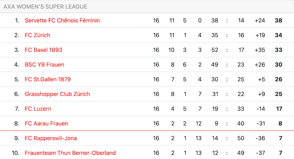Un match palpitant entre premier et deuxième a vu Servette Chênois ramener trois points à la maison pour la onzième fois de la saison. L’équipe guidée par José Barcala a pris l’avantage dès la 20ème minute de jeu par Jonusaite et n’a pas tremblé après l’égalisation bâloise signée Nikolic, preuve étant le but décisif de Simonsson à la 76′.L’équipe genevoise renforce ainsi son leadership, avec désormais 4 points d’avance sur son premier poursuivant à deux journées de la fin de la saison régulière. Une victoire chez la lanterne rouge Thoune garantirait aux Genevoises ce statut de leader, avant le début des playoffs.