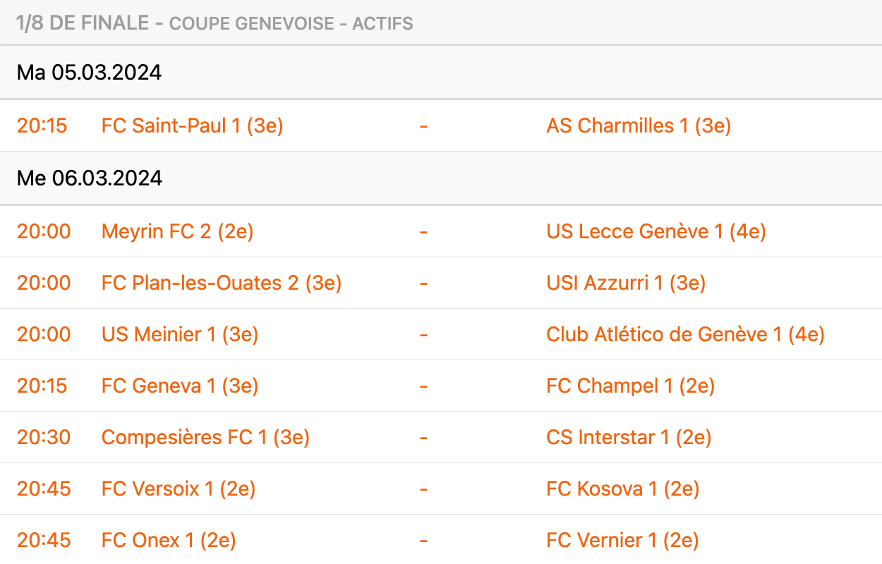 Sur le papier, les quatre autres matchs au programme paraissent moins équilibrés. Le finaliste de 2023 Meyrin II accueille l’US Lecce (mercredi, 20h), pensionnaire de 4ème ligue. Autre représentant de l’avant-dernier échelon régional, l’Atlético tentera l’exploit sur le terrain de l’US Meinier (mercredi, 20h).