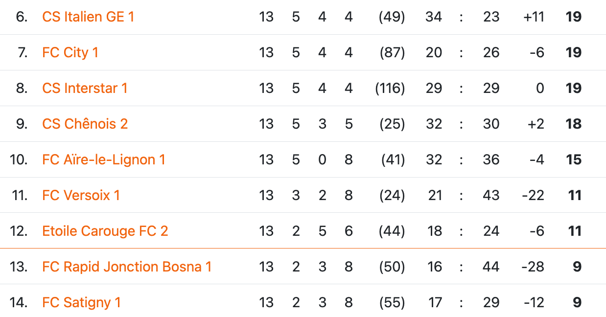 Devant ce quatuor virtuellement relégué à l’heure de la reprise, Aïre-le-Lignon, Chênois II, City et Interstar semblent partir avec un peu plus de garanties. Les Aïrois ont un rendement satisfaisant depuis l’arrivée d’Auro Duarte et ont renforcé leur effectif cet hiver, malgré le départ de leur buteur Ismaili. Après un temps d’adaptation, Interstar semble avoir pris ses marques dans la ligue, tout comme Chênois II. Le FC City a lui récolté des points précieux avant la fin du premier tour et reprend ainsi avec une confortable avance sur la zone rouge.