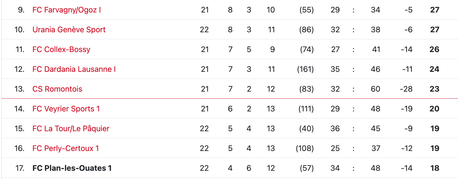 Les prémices pour être optimiste au moment de la reprise du championnat ne manquaient pas côté Plan-les-Ouates. Longtemps derniers pendant le premier tour, les Plan-les-ouatiens avaient récolté 10 points sur 15 possibles juste avant la trêve hivernale. De quoi aborder le deuxième tour avec confiance, d’autant plus au vu du recrutement de certains joueurs d’expérience durant l’hiver.