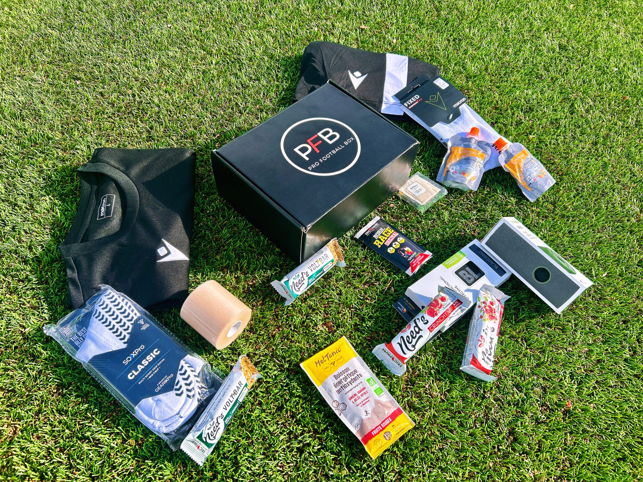 Comme l’indique son nom, ProFootballBox est une boîte remplie de produits variés, utiles à tout footballeur. “Ce sont des produits utilisés par les pros, destinés ici aux footballeurs amateurs, précise le fondateur. En évoluant au niveau amateur, le club ne peut pas se permettre de tout fournir au joueur, il s’agit donc ici d’un complément”.
