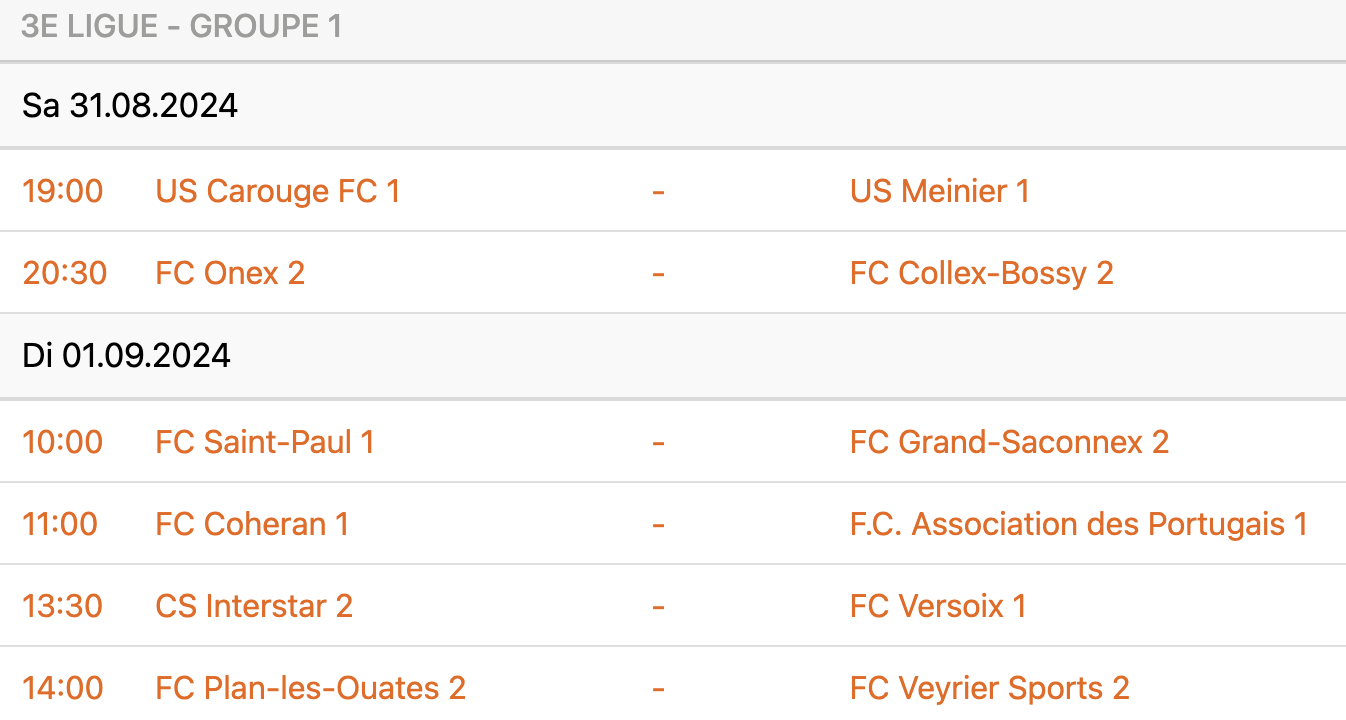 La reprise est fixée à samedi soir, avec déjà un duel entre premières équipes (US Carouge – US Meinier, 19h) qui s’annonce intéressant. Le choc de la première journée aura quant à lui lieu le dimanche matin à la Californie avec Saint-Paul – Grand-Saconnex II.