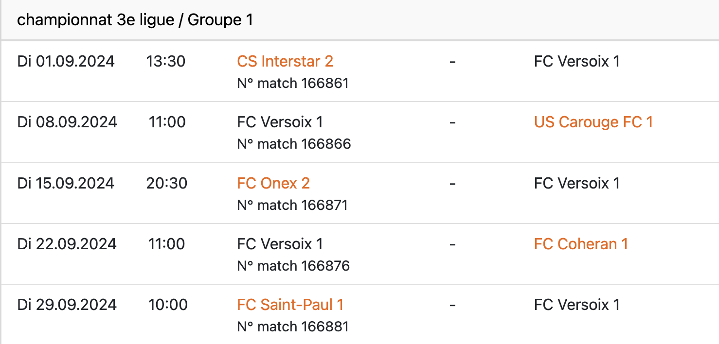 Les 5 premiers matchs de Versoix dans le groupe 1. Les déplacements à Onex et Saint-Paul s’annoncent particulièrement intéressants.