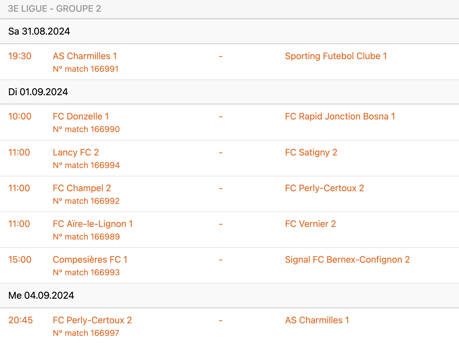 Lors de la première journée, les trois têtes d’affiche joueront à la maison (Charmilles – Sporting, Compesières – Bernex II et Aïre – Vernier II). Un duel de premières équipes est également prévu dimanche à 10h entre Donzelle et RJB. À noter que Perly II et l’AS Charmilles rejoueront déjà l’un contre l’autre le mercredi 4 septembre.