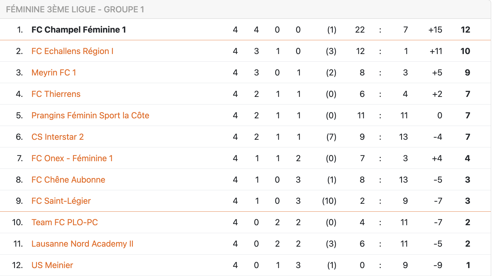 Avec ce quatrième succès en autant de matchs de championnat, les Champeloises caracolent en tête du classement. “Je pense qu’on a une très bonne équipe et qu’on peut faire quelque chose cette année. Mais si on ne met pas l’intensité qu’il faut et qu’on ne joue pas notre jeu, on ne va rien faire du tout”, a prévenu la meilleure buteuse champeloise. Prochain match dimanche (11h) face au Team PLO – Perly-Certoux.