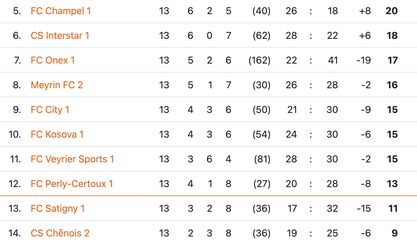 En jetant maintenant un coup d’œil au bas de classement, on remarque que les trois équipes fermant la marche ont cumulé à elles trois un seul point, ce week-end. Chênois II et Perly ont perdu, tandis que Satigny a pris un point à Veyrier. La lanterne rouge est bien l’équipe des Trois Chêne, qui boucle le premier tour avec 9 points en 13 matchs. Retrouvez l’interview de Kevin Gonzalez.