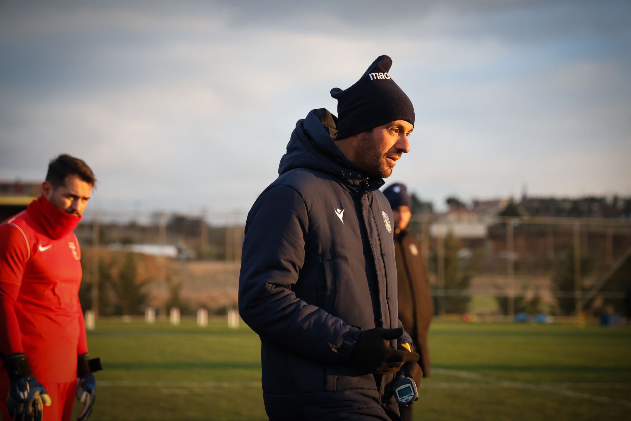 Un membre du staff du club grec de première division donne des consignes aux joueurs du Compesières FC. @temotion.prod