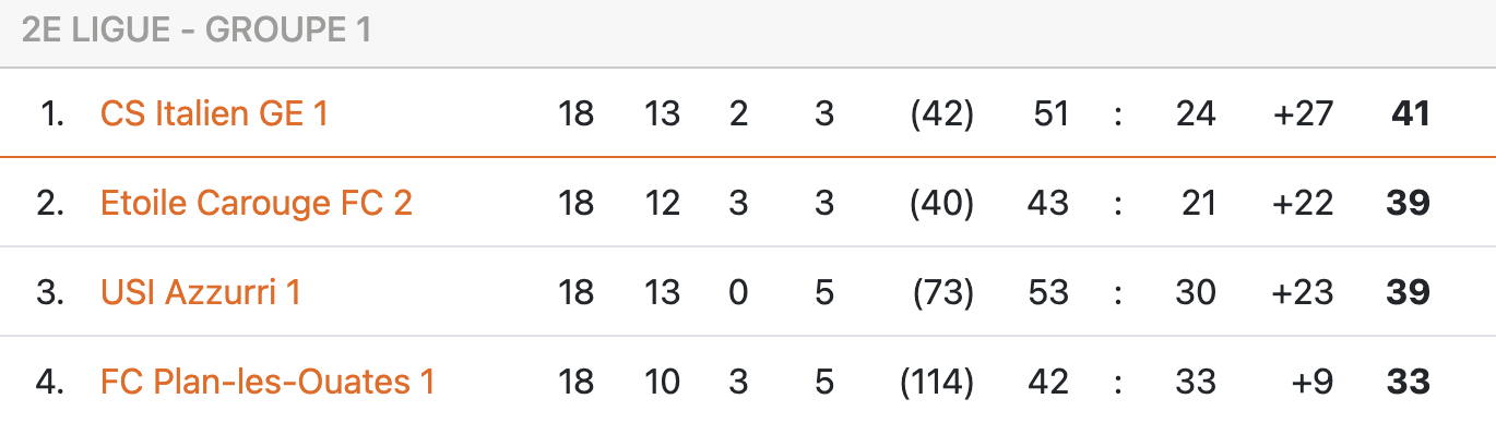 Les pensionnaires des Libellules ont fait preuve d’un grand caractère en revenant au score à deux reprises avant de passer l’épaule par l’intermédiaire de leur capitaine Hosni Yahiaoui contre Plan-les-Ouates (3-2). Grâce à cette quatrième victoire de suite, Azzurri reste à deux petites longueurs du leader CS Italien. Les joueurs d’Helder Silva perdent quant à eux du terrain avec cette deuxième défaite de rang, et les 8 unités les séparant de la première place enterrent presque définitivement leurs espoirs de titre.