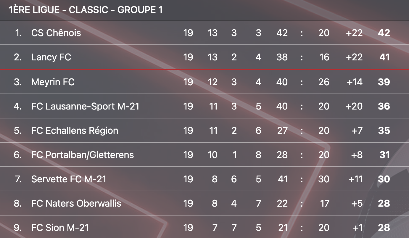 Chênois se retrouve donc seul en tête, avec un impressionnant butin de 42 points en 19 rencontres. Et maintenant ? La suite, à court terme, ça sera avant tout un déplacement périlleux en semaine à Portalban. Camil Belarbi et ses coéquipiers pourront ensuite profiter de 10 jours de pause avant de disputer leur cinquième rencontre de l’année, contre La Chaux-de-Fonds. “On fera les comptes dans 5-6 journées, en essayant de garder cette première place jusqu’à la fin”, a commenté le triple buteur de la soirée. “On a confiance les uns envers les autres. Tous les mecs dans le groupe méritent leur place”.