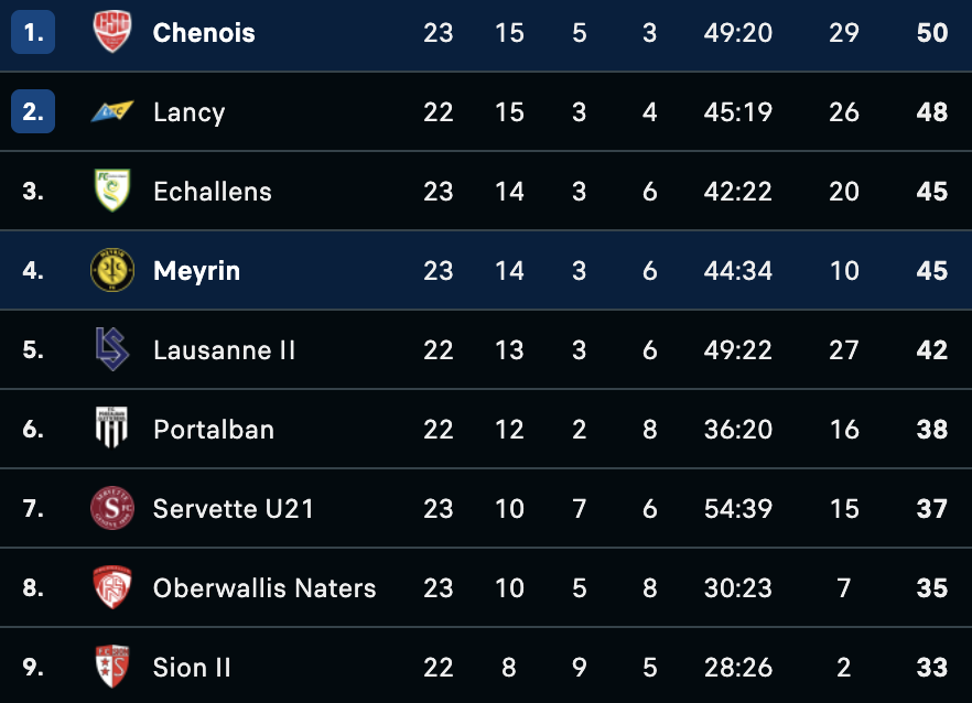 Deux semaines après la débâcle à domicile face à Portalban (0-4), les Meyrinois ont à nouveau perdu trois points et pourraient même descendre à la 5ème place, si les M-21 du Lausanne-Sport parvenaient à s’imposer dimanche 6 avril contre Portalban. Le coach des Jaune et Noir se veut toutefois encore positif : “On n’a encore rien perdu, il reste sept matchs et on peut encore créer une surprise. Je pense qu’on va être là. On a quand même Lausanne ici, on doit aller à Echallens…je pense que ça peut se jouer jusqu’au dernier match“.