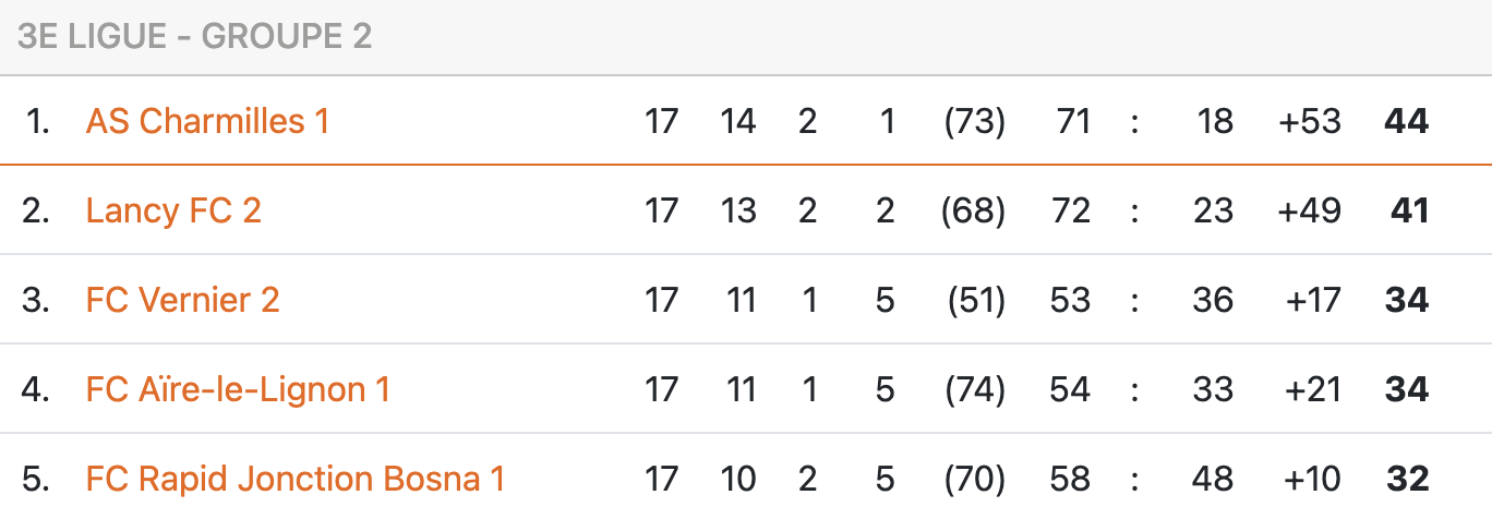 3ème ligue, groupe IIIl faudra attendre dimanche, 14h, pour assister à l’affiche la plus attendue du week-end ! Les deux équipes se tirant la bourre depuis le début de saison, en tête du groupe II de 3ème ligue, s’affronteront dans un duel qui s’apparente à une finale pour la première place. À l’aller, Lancy s’était imposé 3-1. En ce début de deuxième tour, les Lancéens ont néanmoins cédé leur première place à la formation de Jorge Pais, ex-entraîneur de Lancy II, avec qui il avait remporté la Coupe genevoise en 2022. Le choc pour la place de leader entre l’AS Charmilles et le Lancy FC II n’est à manquer sous aucun prétexte !