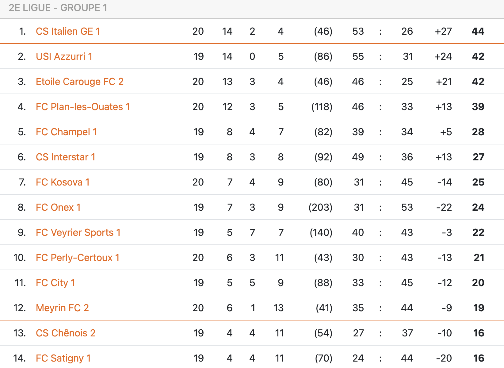 Quel samedi ! Deux grosses surprises ont eu lieu pour le début de la 20ème journée de 2ème ligue. Les deux équipes de tête (CS Italien, 44pts / Etoile Carouge II, 42pts) se sont inclinées à domicile, contre Plan-les-Ouates (0-1) et Kosova (1-3). Ces résultats pourraient rabattre les cartes dans le haut de tableau, et surtout profiter à l’USI Azzurri, qui a l’opportunité de prendre seul les commandes en cas de victoire chez le CS Chênois II, dimanche 13 avril (16h).