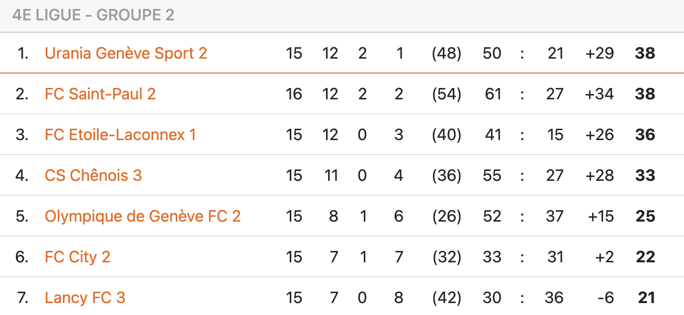 Le dimanche 11 mai (déplacement à Frontenex pour affronter UGS II) est donc une date à noter en rouge dans le calendrier, puisque cette affiche pourrait ressembler à une finale pour la première place du groupe II de 4ème ligue, sans oublier Etoile-Laconnex et Chênois III. Avant de trop se projeter, les hommes de Tomasz Morycki devront être capables d’enchaîner, notamment dimanche 13 avril contre le FC Aïre-le-Lignon II à domicile (13h).