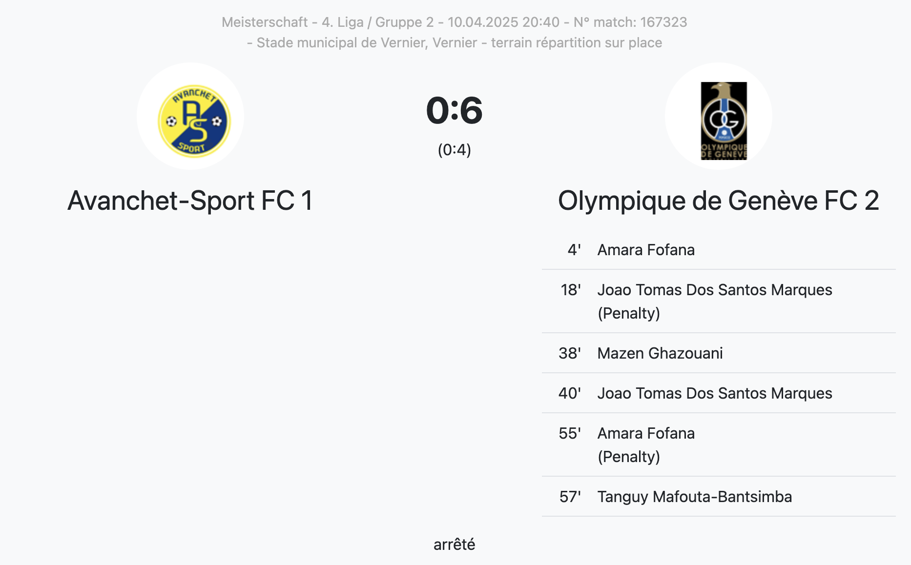 Jeudi 10 avril, le match de 4ème ligue entre Avanchet et la Deux de l’Olympique de Genève a été arrêté à l’heure de jeu en raison d’incidents violents ayant eu lieu en dehors du terrain.