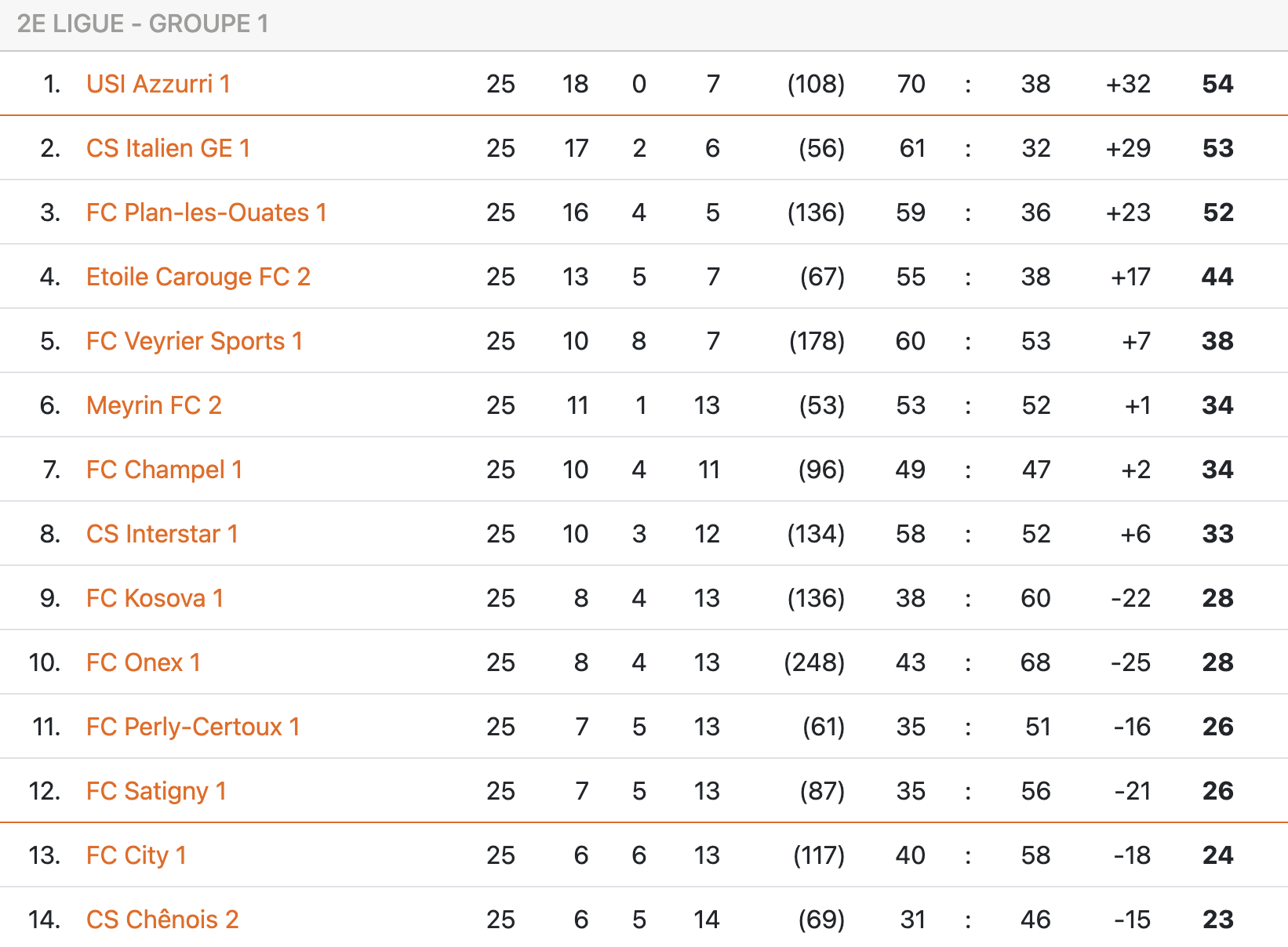 PLO est la seule équipe du trio de tête a avoir fait un faux pas ce week-end. Alors qu’ils étaient à égalité de points avec Azzurri (moins bon coefficient fair-play), les Plan-les-Ouatiens avaient l’occasion de mettre la pression sur leurs deux concurrents en jouant samedi soir déjà (18h). Toutefois, l’équipe d’Helder Silva n’a obtenu qu’un point contre City (1-1), et compte à présent deux points de retard sur le leader (ainsi qu’un moins bon coefficient fair-play) à une journée de la fin. Pour être champion, PLO devra battre Kosova lors de la J26, espérer qu’Azzurri perde contre City et que le CS Italien ne gagne pas contre Champel.