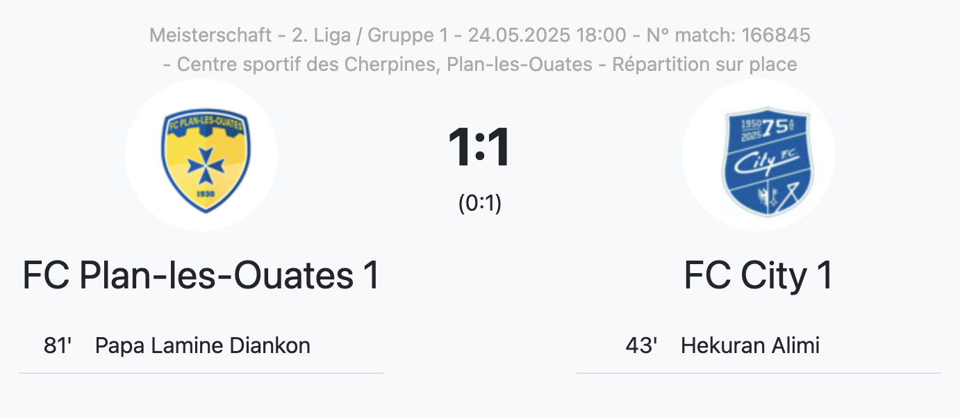City et Chênois II doivent donc obligatoirement s’imposer lors de la dernière journée, et espérer des défaites de leurs concurrents, pour se sauver. City affrontera Azzurri aux Libellules, tandis que Chênois II accueillera Etoile Carouge II. Rendez-vous dimanche 1er juin.