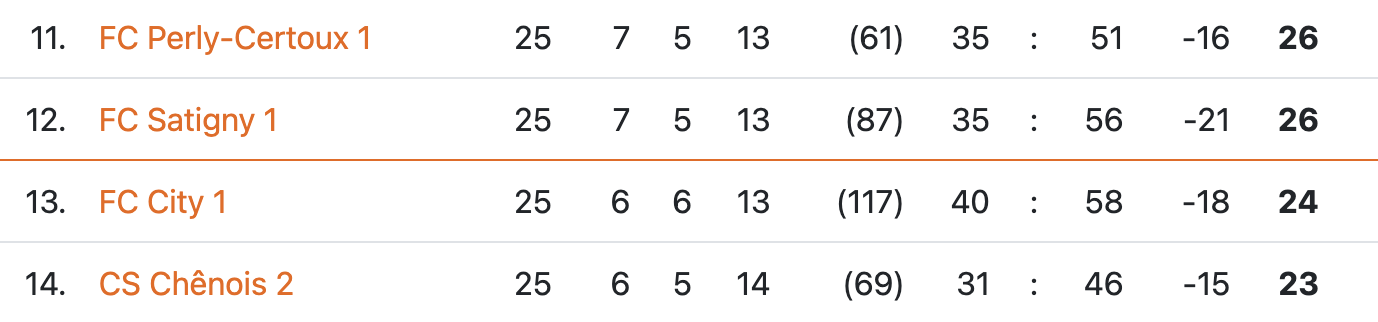 Avec un match nul, Perlysiens et Satignotes ne pourraient plus être rattrapés par Chênois II. Avec ce même résultat, en supposant que City gagne contre Azzurri, Perly et Satigny seraient rejoints par City, mais resteraient devant grâce à leur meilleur coefficient fair-play.