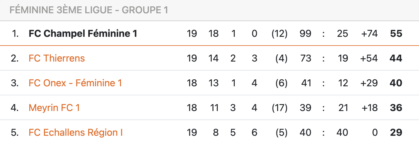 Revenons sur le parcours plus qu’impressionnant des Champeloises. À trois journées de la fin du championnat, ces dernières sont encore invaincues et ne comptent qu’un match nul. Les chiffres donnent le tournis : 5.2 buts par match et 2.89 points par match. Il n’a manqué qu’une petite réalisation à Champel pour dépasser la barre des 100 buts ce samedi déjà.