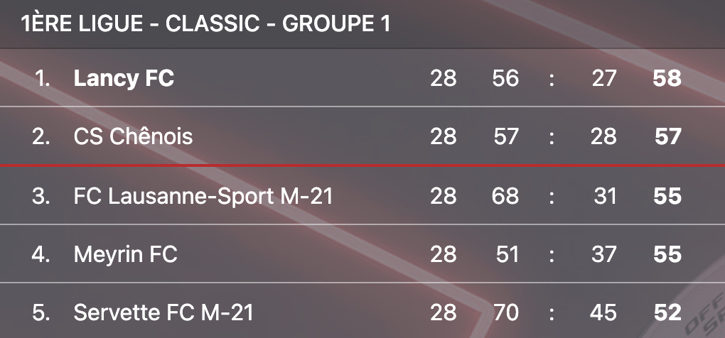 Ce succès a permis à Lancy de repasser en tête du groupe 1 de 1ère ligue Classic, avec 58 points. Par conséquent, en cas de nouvelle victoire ce samedi 17 mai contre La Chaux-de-Fonds, les Lancéens pouvaient s’assurer une place sur le podium, et donc un ticket pour les finales de promotion, dès l’avant-dernière journée.