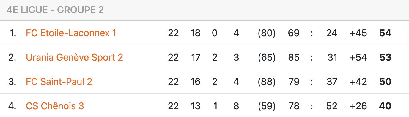Jusqu’à la dernière journée, la lutte avec UGS II (que les Grenat auront battu deux fois cette saison) a été des plus disputées. Au final, Laconnex est parvenu à prendre le meilleur sur son concurrent, tandis que les Violet devront passer par la case barrage (contre Geneva et Cerceda, autres deuxièmes de groupe). Pour rappel, deux des trois deuxièmes seront promus.