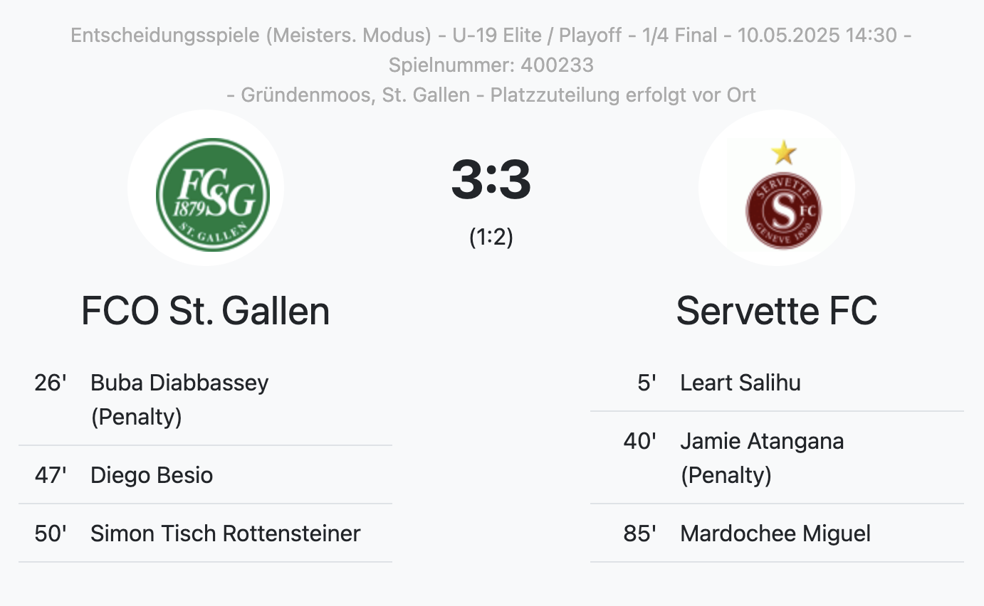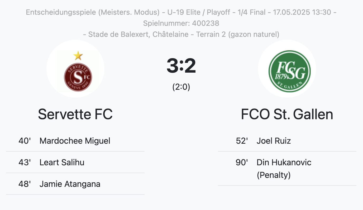 L’équipe de Geoffrey Tréand devait donc s’imposer, samedi 17 mai, pour accéder au tour suivant. Et bien les Servettiens ont fait le plus dur en marge de la mi-temps. Mardochee Miguel (40′), Leart Salihu (43′) et Jamie Atangana (48′), encore eux, ont permis aux Grenat de mener 3-0. Les Saint-Gallois n’ont pas abdiqué, et se sont même retrouvés en supériorité numérique à la 65′ après l’expulsion de Florent Ramushi lorsque le score était de 3-1. Le but du 3-2 est toutefois tombé trop tard (90′) pour permettre aux Brodeurs de compléter leur remontée. Servette verra les demies !