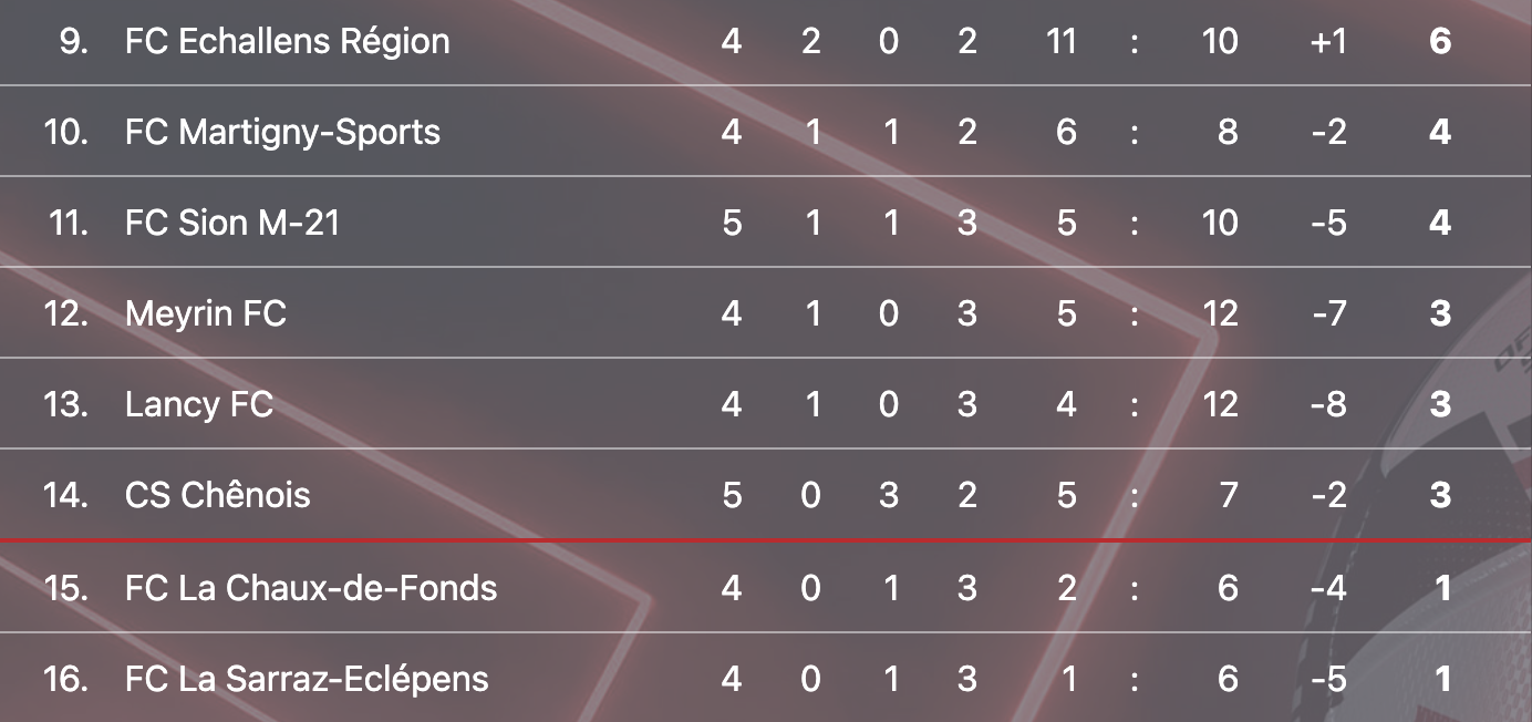 Toujours pas ! La cinquième journée de championnat semblait enfin être la bonne pour Chênois, qui pensait débloquer son compteur de victoires en championnat (3 nuls, 1 défaite avant ça). Pourtant, en seulement quelques minutes, les Sédunois ont renversé le match, et conduit les pensionnaires des Trois-Chêne vers leur deuxième revers de l’exercice. “En crise ? Non. On aimerait bien sûr jouer le haut, mais on n’a pas des dirigeants qui nous mettent le couteau sous la gorge”, a tempéré l’entraîneur David Joye. “Si c’est une saison où ça doit prendre plus de temps ou si c’est une saison avec une autre histoire, c’est le football. Il faut rester tranquille, lucide, et essayer de trouver des solutions”.