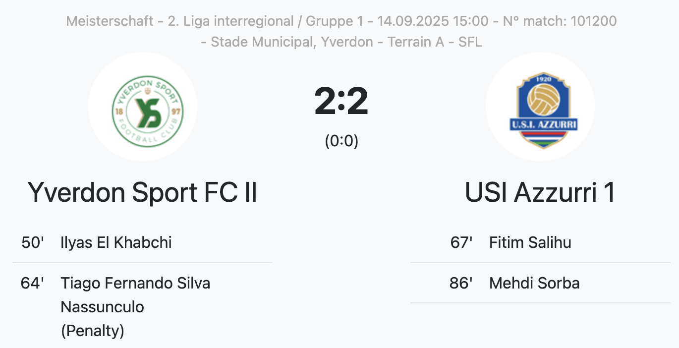 L’irrégularité que l’USI Azzurri reproche à son adversaire est la suivante : Yverdon II aurait fait entrer en jeu un joueur qui n’était pas sur la feuille de match au coup d’envoi de la rencontre. Il s’agit d’Achilles Artieda, qui a remplacé Noa Vazquez à la 77ème minute.