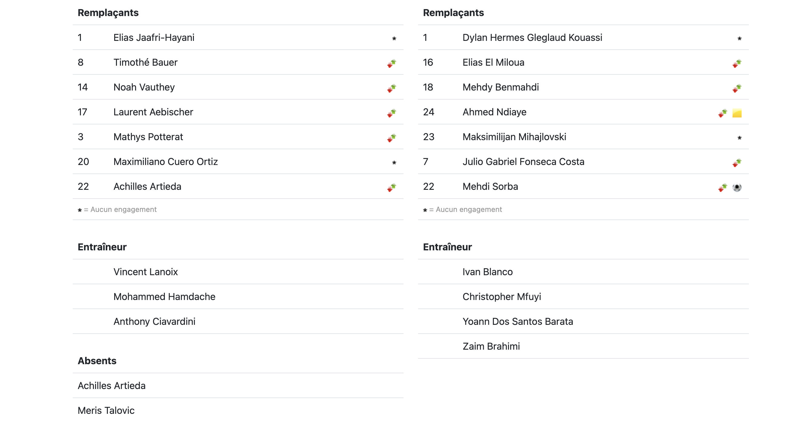 Le club genevois assure, captures d’écran à l’appui, que ce dernier n’était pas sur la feuille de match au coup d’envoi, mais qu’il a été ajouté sur le système seulement après le coup de sifflet final. En l’état actuel des choses, sur la feuille de match en ligne et disponible en libre accès, le nom du joueur en question figure aussi bien dans la liste des remplaçants que des absents (voir capture d’écran ci-dessous).