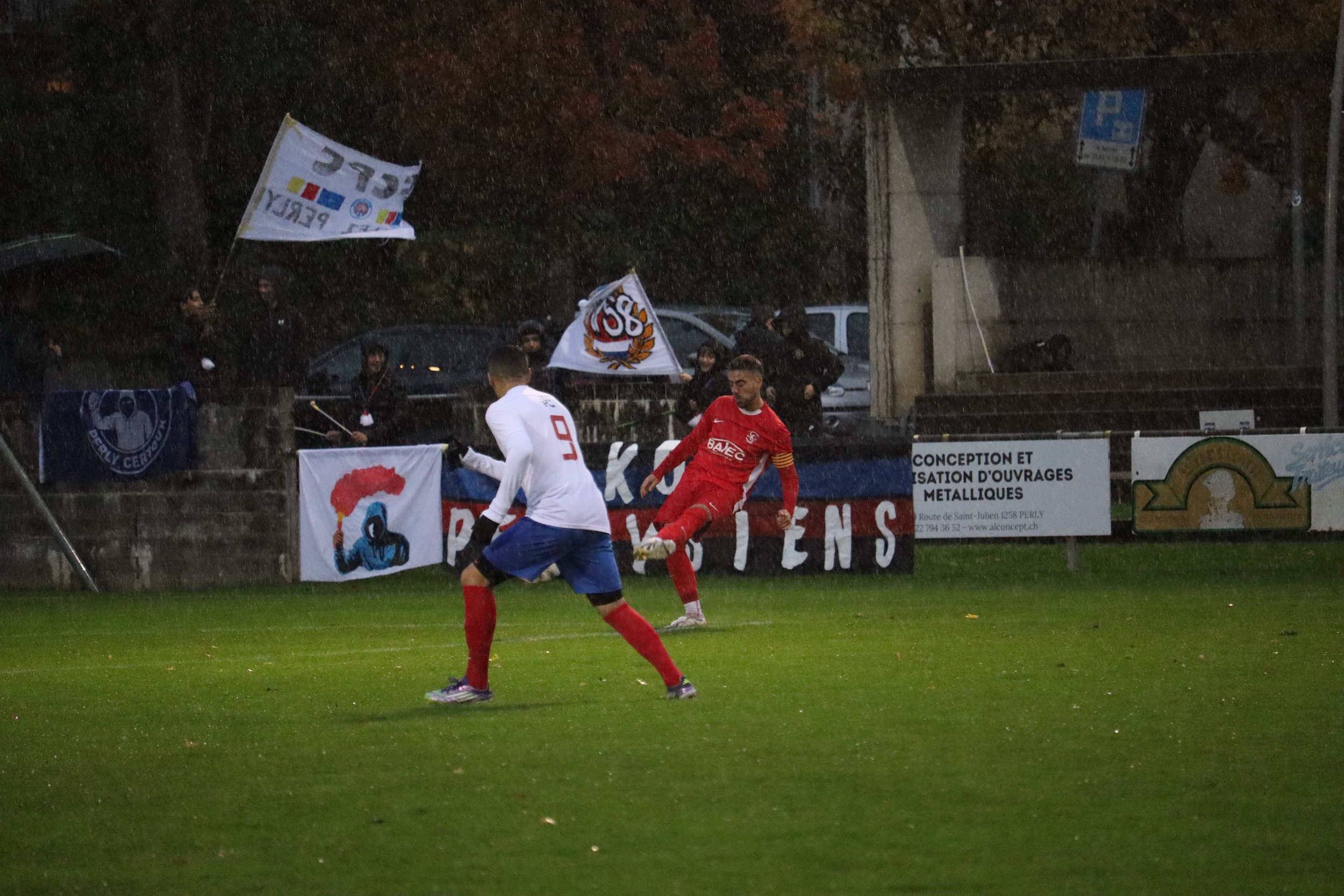 Satigny ne s’est pas fait attendre dans la partie, et a rapidement ouvert le score grâce à un beau coup de tête de Michael Moreno, laissé seul dans la défense locale sur coup-franc (2′, 0-1). Même si les buts ont été au rendez-vous, le beau spectacle n’a lui pas osé braver la pluie torrentielle qui s’est abattue sur le stade municipal de Perly. A l’instar du deuxième but satignote, où Samuel Tessaro a récupéré la possession à Yoan Fernandez, après que le ballon se soit prématurément arrêté dans une flaque d’eau à l’orée des 16 mètres perlysiens (9′, 0-2).