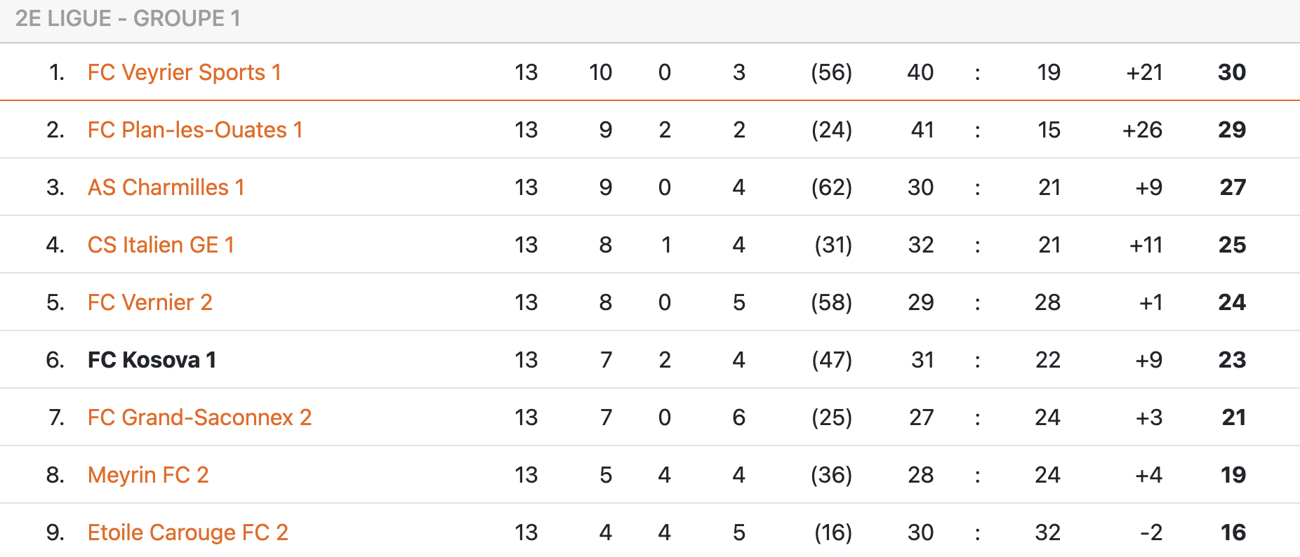 Pour rappel, la première équipe du FC Kosova sort d’un premier tour plutôt positif, surtout en deuxième partie de celui-ci, et est actuellement 6ème avec 23 points en 16 matchs, à 7 points du leader Veyrier.