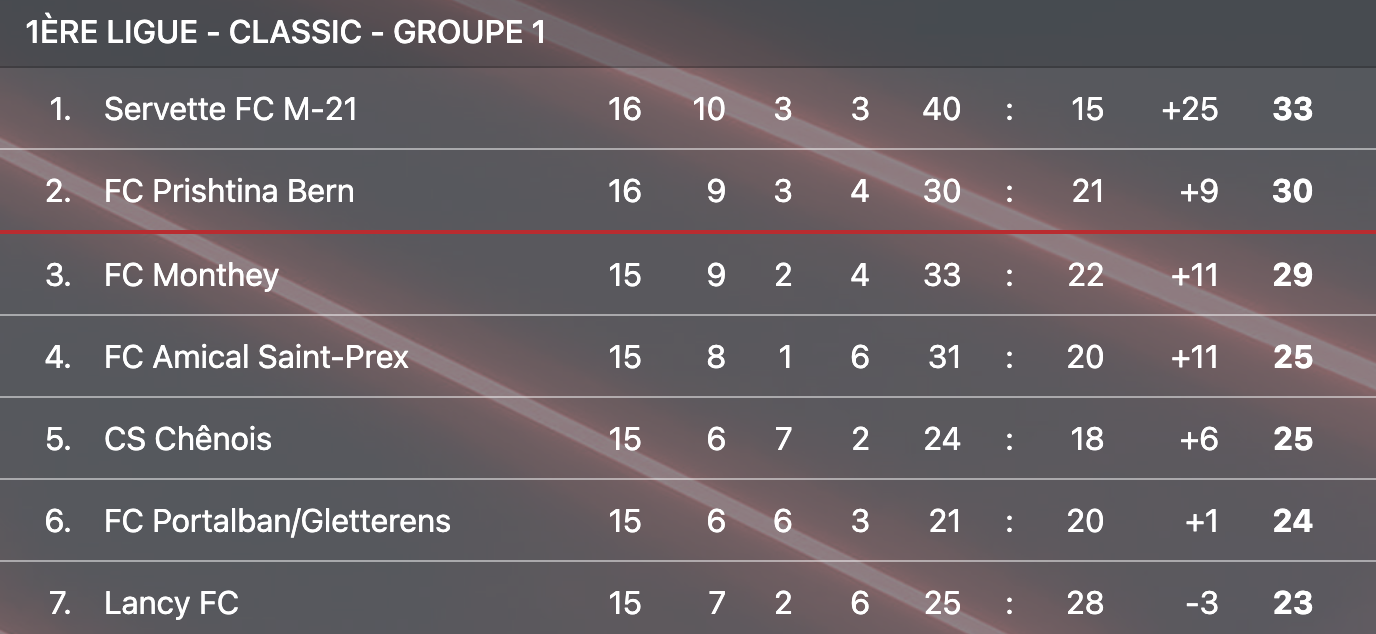 Les Grenat ont eu de la peine à rentrer dans leur match sur une pelouse difficile à manœuvrer. Les joueurs de Jeff Saibene se sont réveillés en fin de première période et ont multiplié les assauts sur les buts d’Hassan Taleb, sans parvenir à trouver le chemin des filets. La deuxième mi-temps a été compliquée pour les jeunes Servettiens, qui n’ont jamais réussi à retrouver l’intensité qu’ils avaient mis en fin de première mi-temps. Le leader voit ainsi Prishtina Bern, vainqueur de Sion, revenir à 3 points. Le résultat de Saint-Prex, 4e, qui se déplacera chez la nouvelle lanterne rouge La Sarraz ce dimanche 22 février, sera également à surveiller.