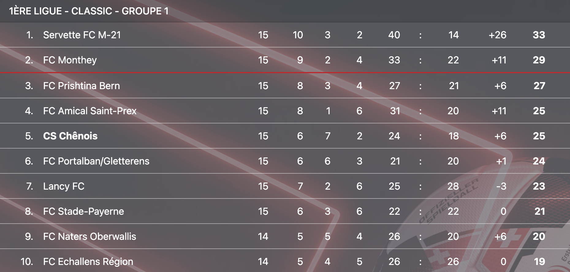 Tout cela étant dit, il convient à présent de s’intéresser à la situation du CS Chênois au classement. Pour rappel, la formation des Trois-Chêne avait peiné à relancer la machine en début de saison (5 matchs, 3 points, 0 victoire), avant d’enchaîner 10 matchs sans défaite (6 victoire, 4 nuls, 22 points) et de revenir ainsi dans la course aux finales de promotion.