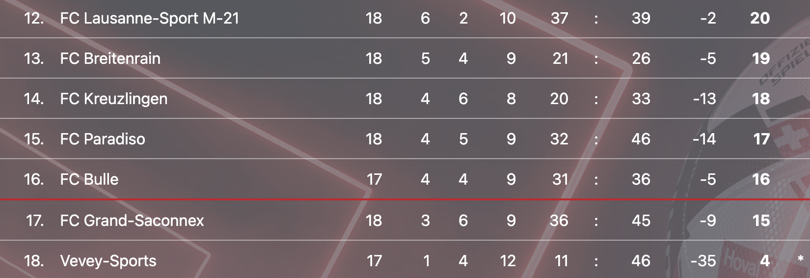 Une bonne raison de voir le verre à moitié plein côté Grand-Saconnex vient aussi des autres terrains. Au vu des défaites de Bulle, Paradiso et Kreuzlingen, la troupe de Jean-Michel Aeby a déjà grignoté un point sur ses concurrents. Dimanche 22 février, les pensionnaires du Blanché se déplaceront à Bulle en n’étant qu’à une petite unité des Gruériens, situés juste au-dessus de la barre…. “Il faudra bien se reposer et être prêt à aller batailler sur un terrain en herbe qui sera certainement gras”, a conclu l’entraîneur saconnésien.
